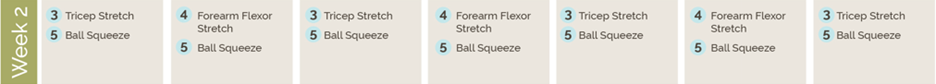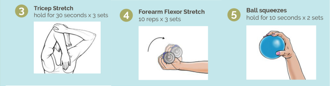 To strengthen your forearm and elbow, perform the triceps stretch, forearm extensor stretch, and ball squeeze alternately. Numbers 3, 4, and 5 in the 30-Day Calendar.