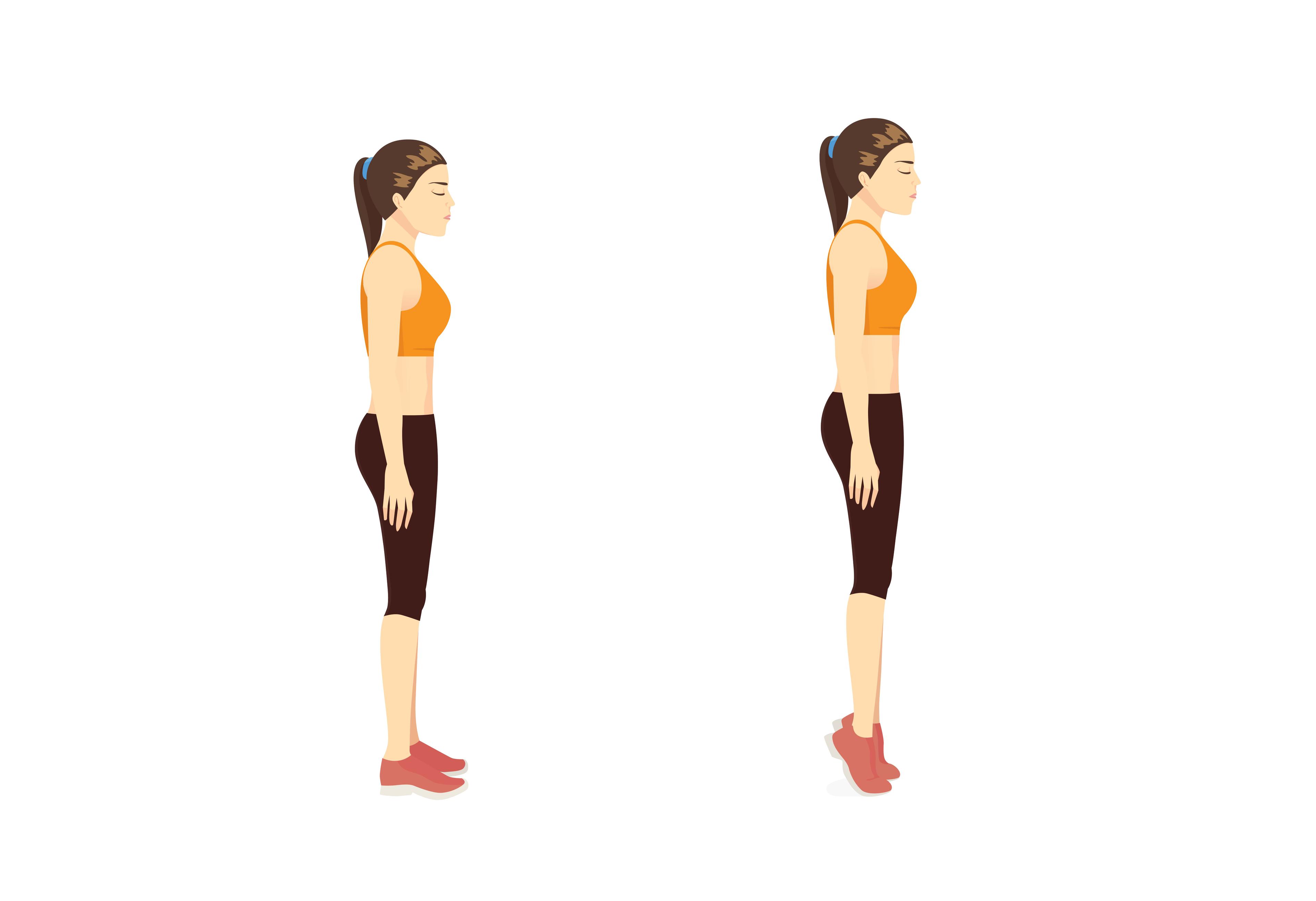 - Begin by standing with feet shoulder-width apart, knees slightly bent, and hands-on-hips.